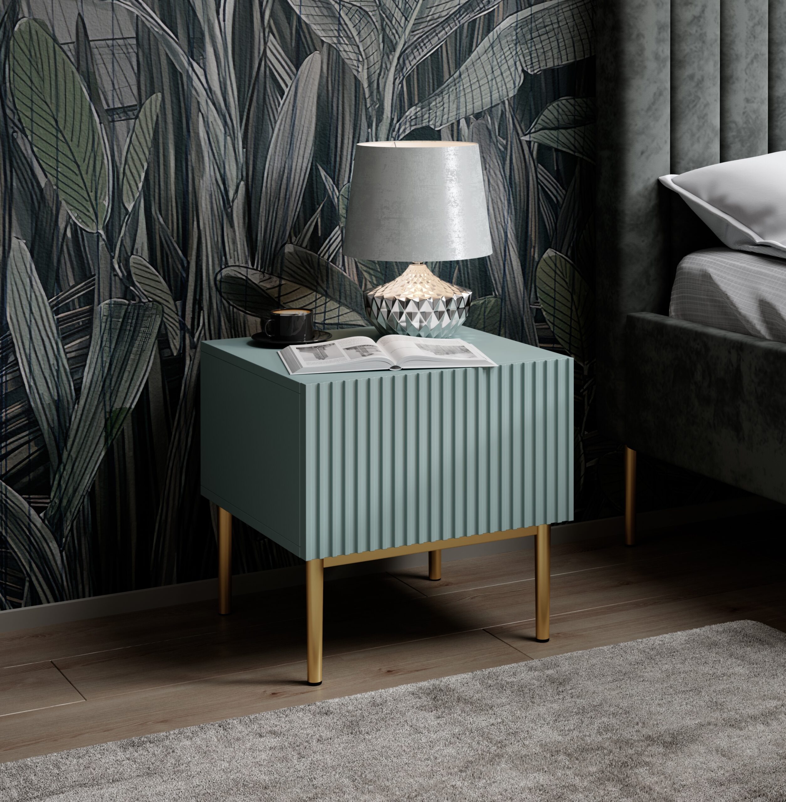 Nicole éjjeliszekrény készlet 2 db. – zsályás MDF / aranyozott lábak, szélesség: 46, magasság: 45, mélység: 45, láb magassága: 20. Nicole éjjeliszekrény készlet 2 db. – MDF zsálya / arany