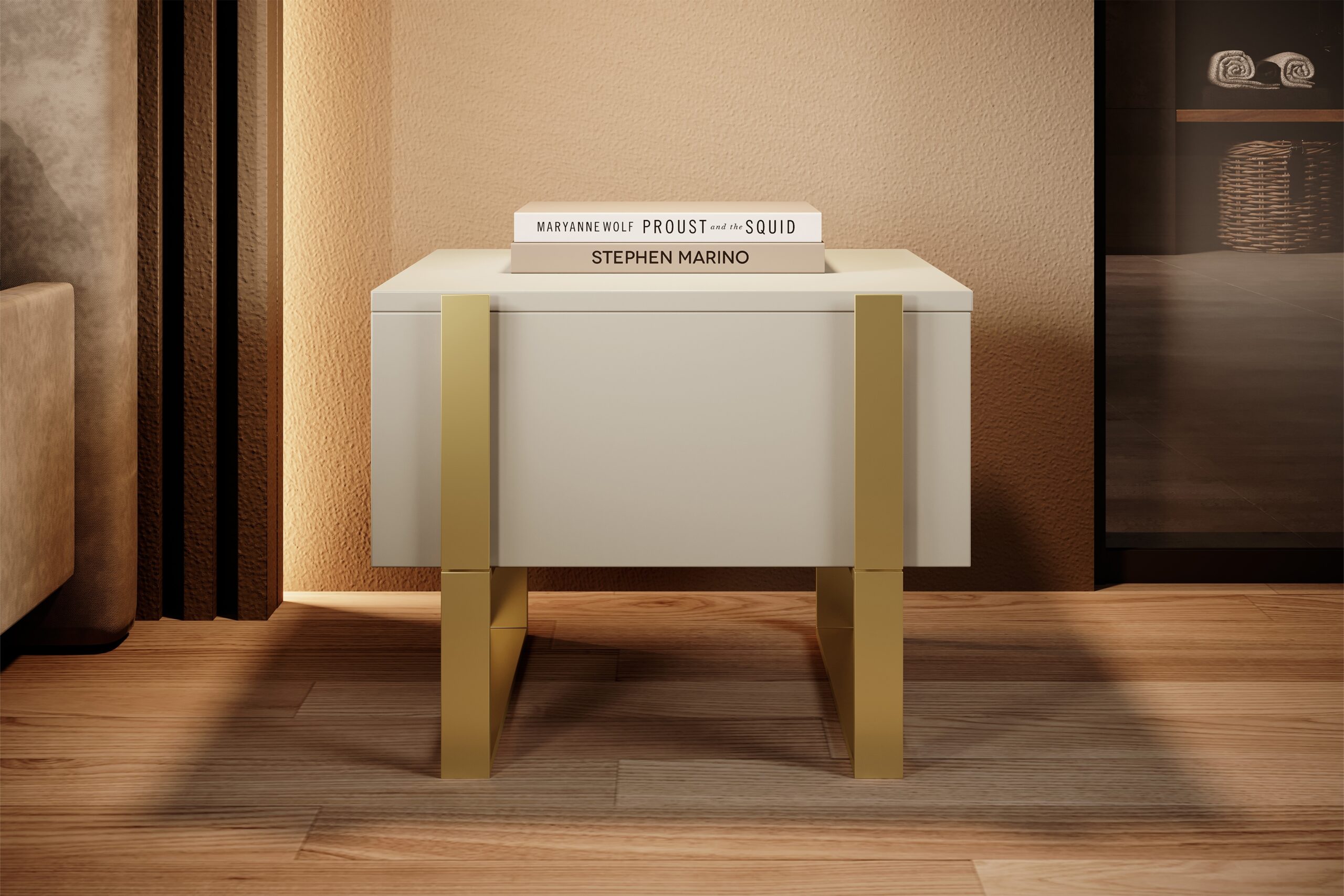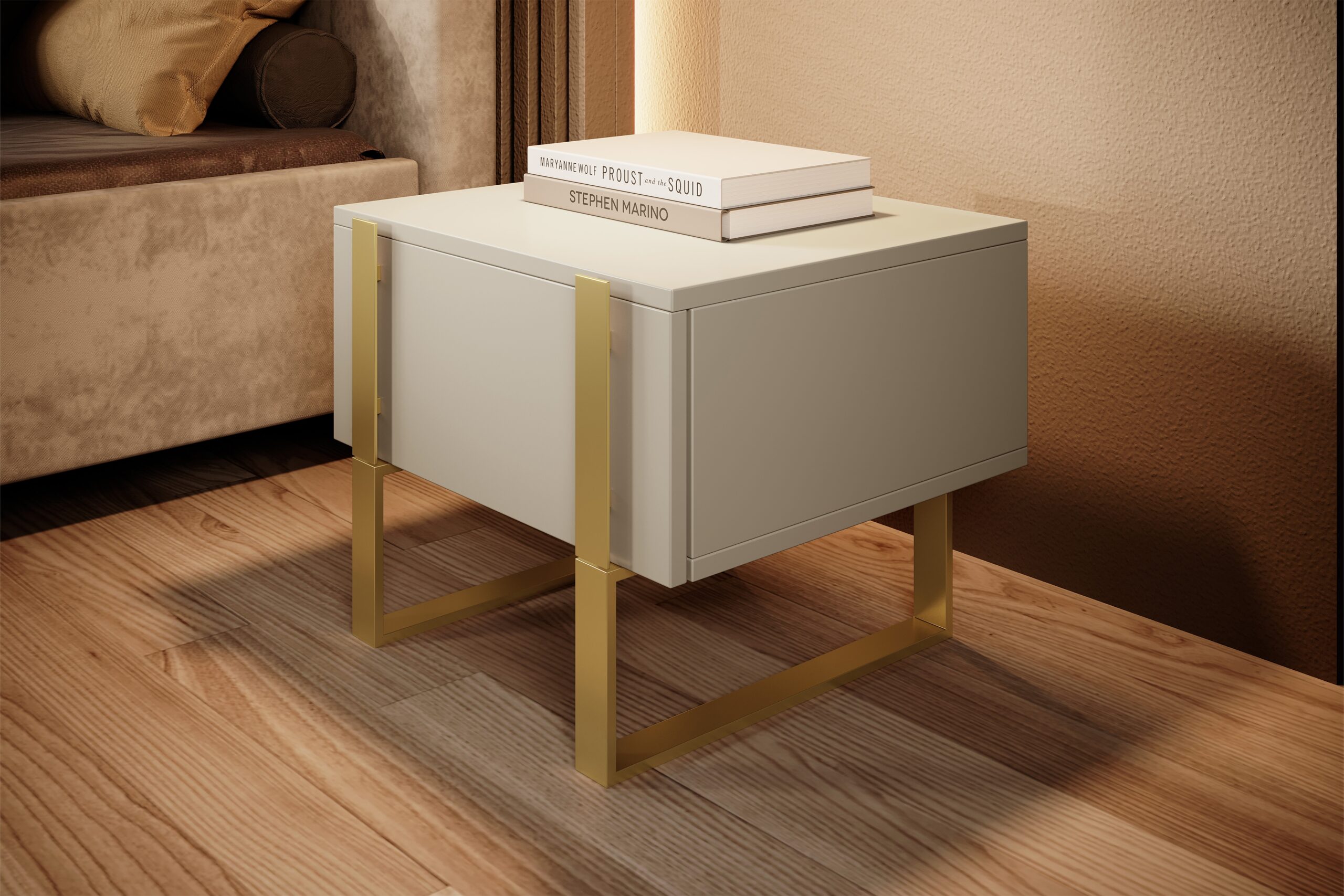 Verica éjjeliszekrény 2 db-os. – kasmír / aranyozott lábaknnSzín: világos, krémnAnyagok: forgácslap, laminált táblanTípus: állónStílus: modern, dizájnernnMéretek:nMéretek:nMéretek:n>Magasság: 4 n 0nSúly: 33,3 kgnnBecsült szállítási idő: 90 napnnÖsszeszerelés:nA termék nincs összeszerelve. Az összeszerelés gyors és egyszerű, a csomagban található összeszerelési útmutató alapján 40-50 perc alatt elvégezhető.nA feltüntetett ár nem tartalmazza az összeszerelést, a termékbemutató képen látható egyéb bútordarabokat és kiegészítőket.nn