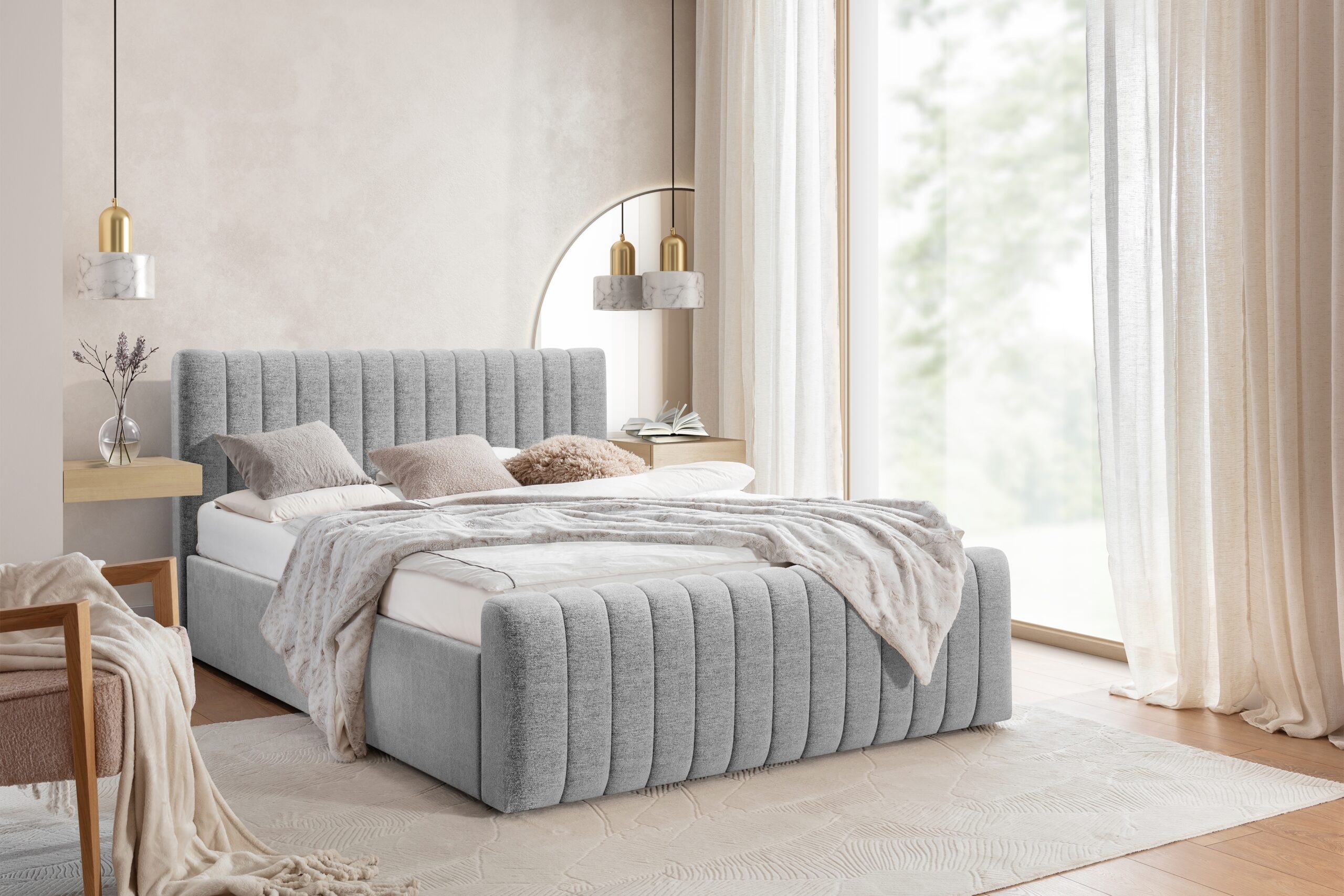 Nicole tárolóágy – 140×200, Raven 06, szélesség: 150, magasság: 106, mélység: 226, matrac méretei: 140×200, ülőmagasság: , összeszerelés: , lábmagasság: 2,5. Elegáns kárpitozott ágy magas fejtámlával és aranyozott lábakkal.