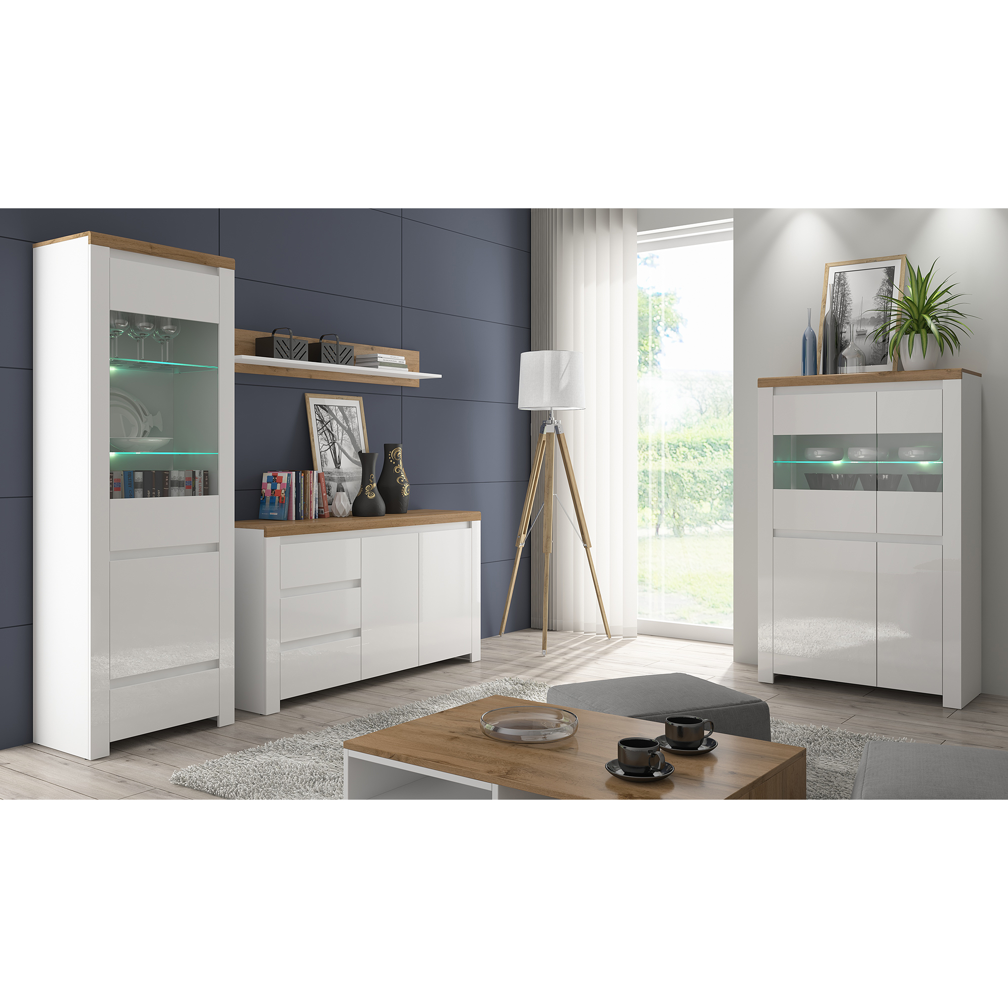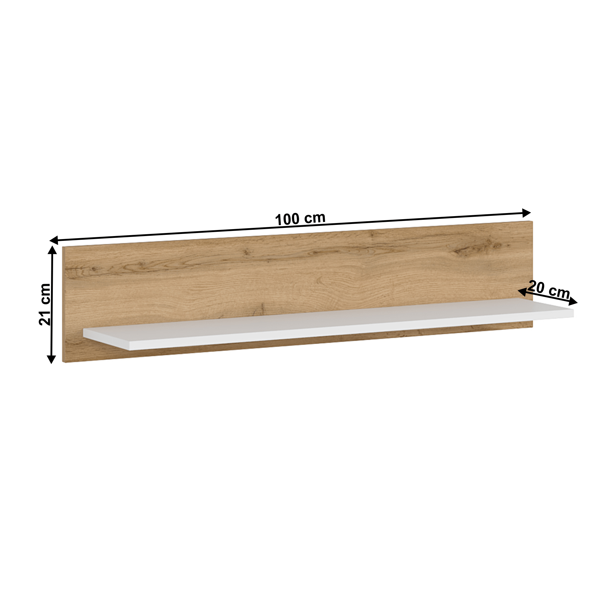 Anyag: laminált DTD/ABS élek Szín: fehér/wotan tölgy Méretek(SzxMéxMa): 100x20x21 cm Anyag vastagsága: 1,6 – 2,2 cm Teherbírás: 2 kg Nyitott tárhely ABS élek Bontásban szállítva