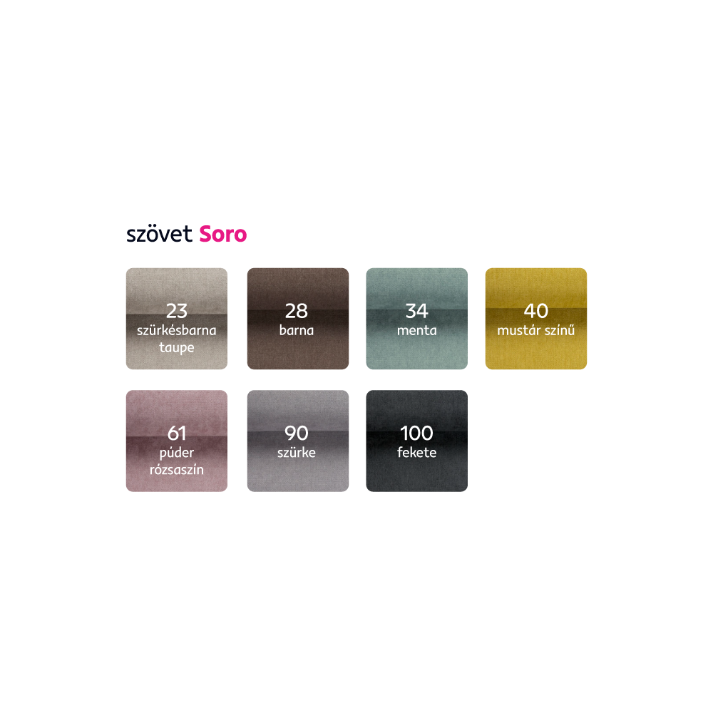A kanapét a Soro szövet 7 színváltozatában megvásárolhatja a mintafüzet alapján is BUTON R összecsukható 755 900 Ft és BUTON P fix 696 500 Ft.. Választását közvetlenül a megrendelés megjegyzései közé írja be. Egyedi megrendelés esetén az adott összeg 20%-át előlegként szükséges befizetni. Az előleg befizetése után a kérése gyártásba kerül. A szállítási idő 6-8 hét.