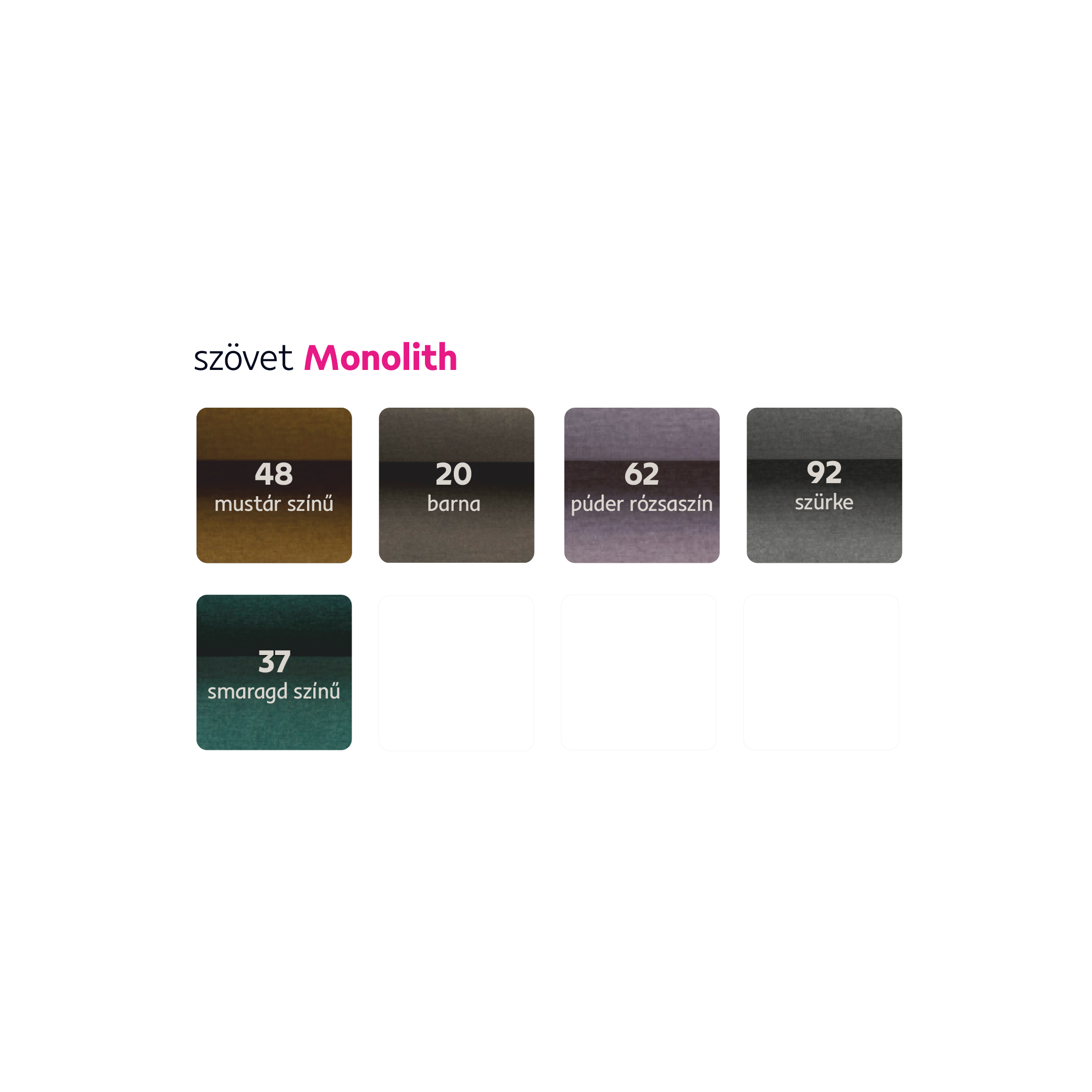 Rendelhető 5 Monolith szövet színváltozatban ár 564 900 Ft. Egyedi megrendelés esetén szükség van az adott összegnek a 20%-át befizetni,mint előleg. Az előleg befizetése után az Ön követelményét benyújtjuk a gyártónak. Szállítási idő 6-8 hét.