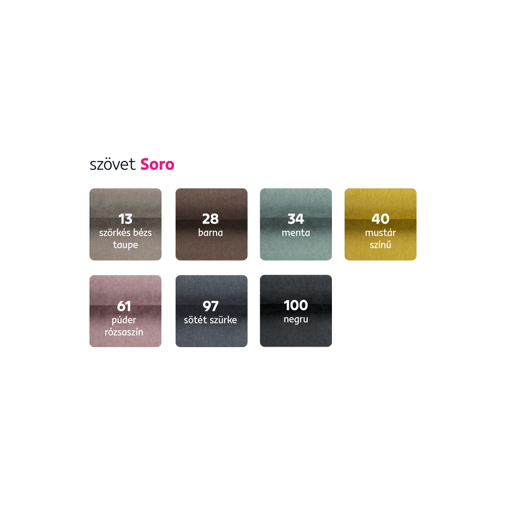 Megrendelhető a Soro szövet 7 színváltozatában 705 500 Ft áron. Egyedi megrendelés esetén az adott összeg 20%-át előlegként szükséges befizetni. Az előleg befizetése után a kérése a gyártásba kerül. A szállítási idő 6-8 hét.