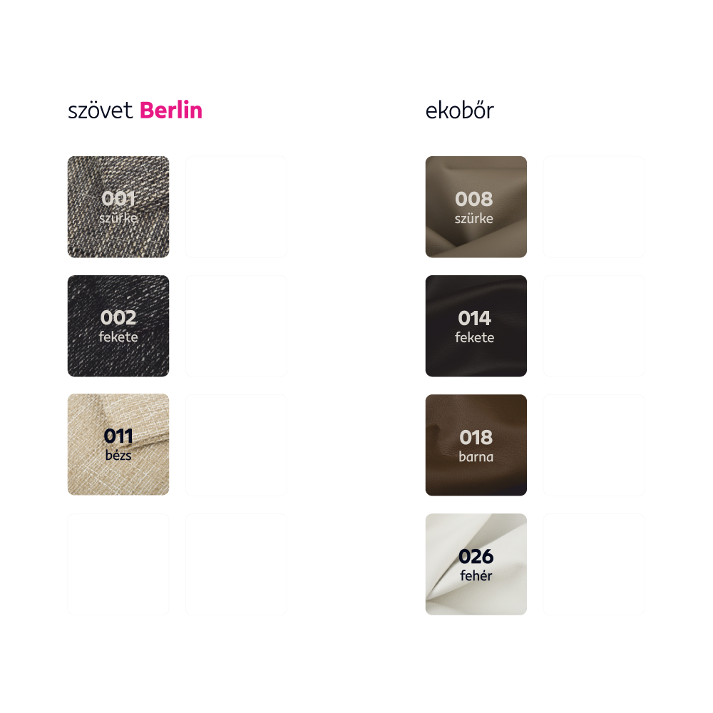 Megrendelés lehetséges 4 színváltozatban textilbőrből és 4 színváltozatban Berlin szövetből, ár 358 500 Ft. Egyedi megrendelés esetén szükség van az adott összegnek a 20%-át befizetni,mint előleg. Az előleg befizetése után az Ön követelményét benyújtjuk a gyártónak. Szállítási idő 6-8 hét.
