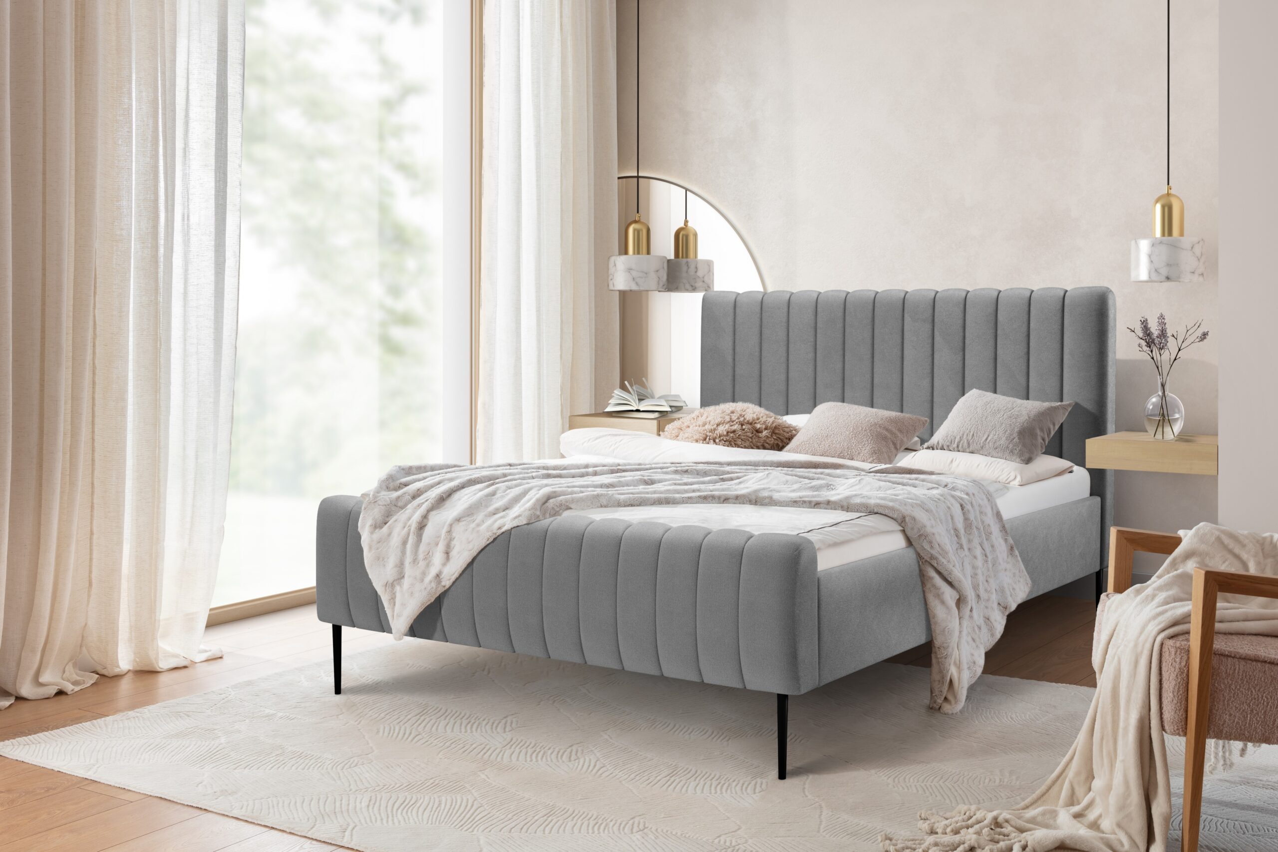 Nicole hálószoba kárpitozott ágy – 120×200, Salvador (SIC) 14/fekete lábaknnMéretek:nMéretek: 131 x 125 x 228nMélység: 228nSúly: 5strong>szállítási idő:5.nn2 nap nnÖsszeszerelés:nA termék nincs összeszerelve. Az összeszerelés gyors és egyszerű, a csomagban található összeszerelési útmutató alapján 40-50 perc alatt elvégezhető.nA feltüntetett ár nem tartalmazza az összeszerelést, a termékbemutató képen látható egyéb bútordarabokat és kiegészítőket.nn