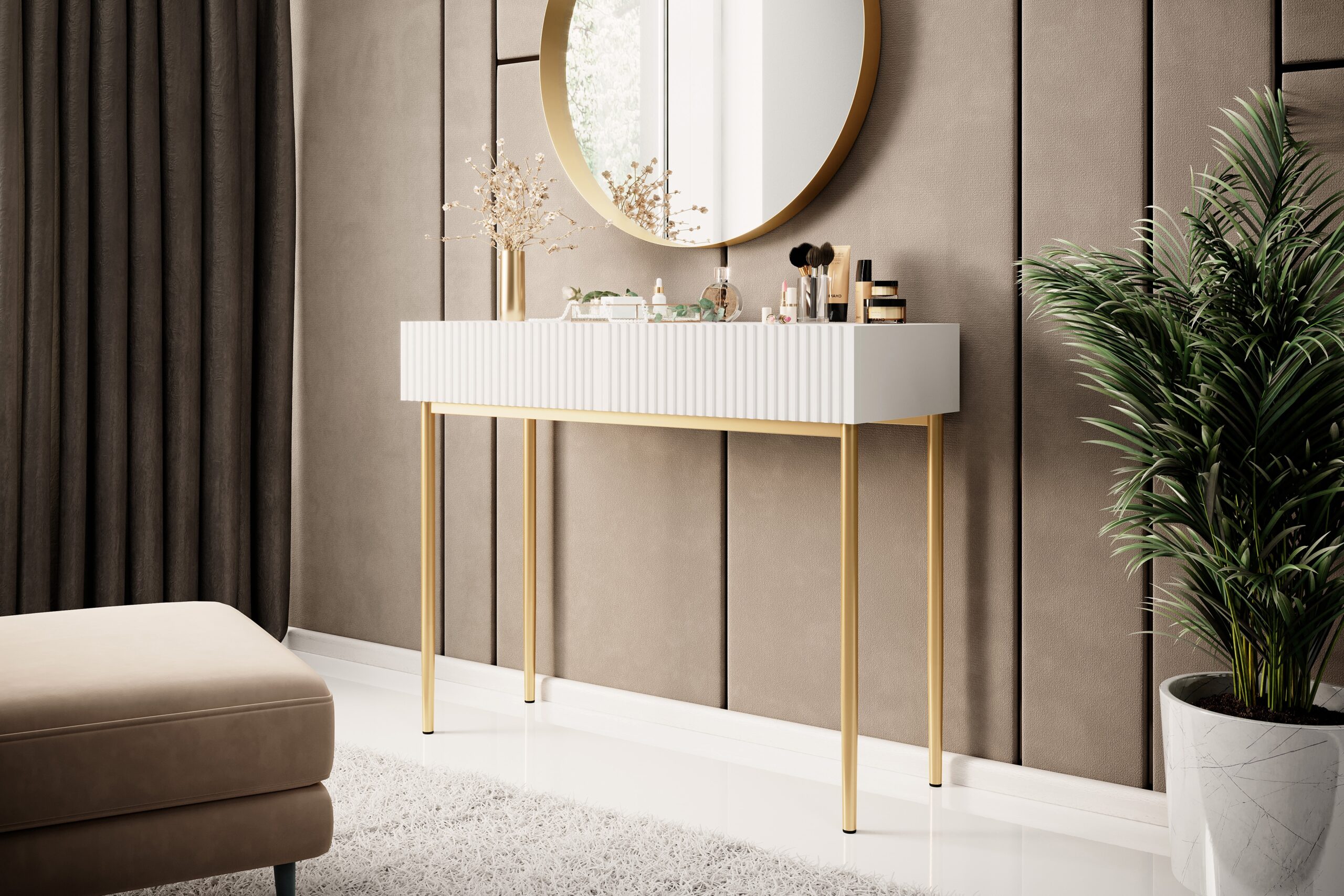 Nicole modern konzol / fésülködőasztal – matt fehér / aranyozott lábak