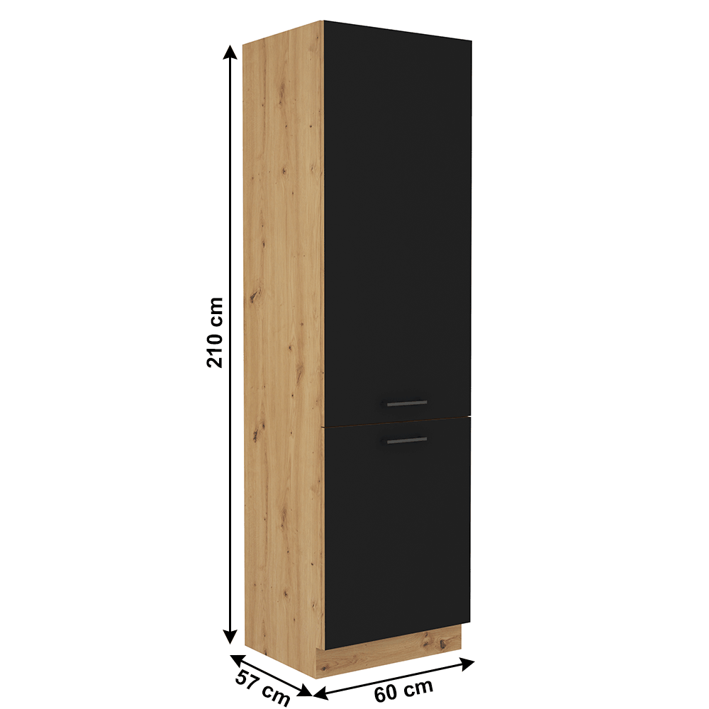 Szekrény beépített hűtőre, matt fekete/artisan tölgy, MONRO 60 LO-210 2F