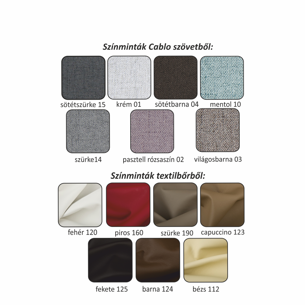 Lehetséges megrendelni a Cablo szövet 7 féle színváltozatában, vagy 7 féle textilbőrrel kombinálva. Egyedi megrendelés esetén szükség van az adott összegnek a 20%-át befizetni,mint előleg. Az előleg befizetése után az Ön követelményét benyújtjuk a gyártónak. Szállítási idő 6-8 hét.