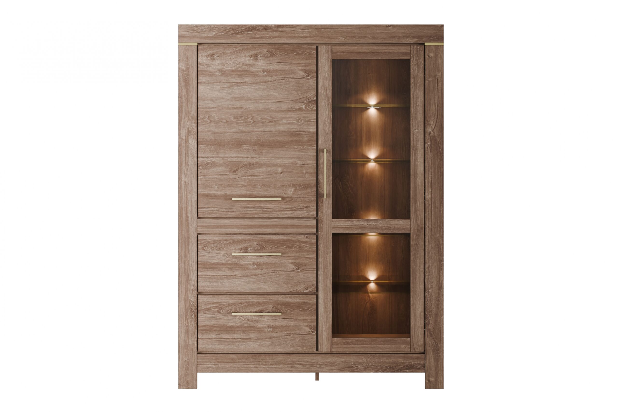 Német vitrin 115 cm fiókokkal – tölgy szélesség: 115, Magasság: 158,5, mélység: 42, Összeszerelés: , Lábmagasság: .